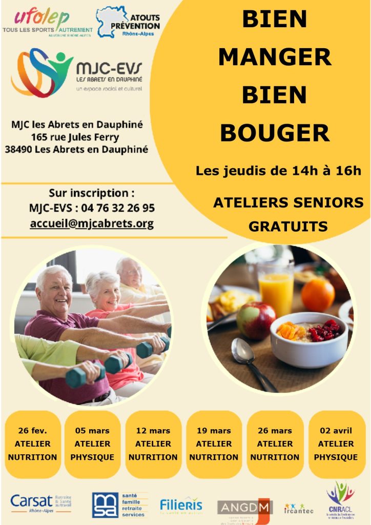 Des atelier séniors gratuits “Bien manger, bien bouger” sont organisés les jeudis 26 février, 05, 12, 19 et 26 mars et jeudi 02 avril 2026 de 14h à 16h aux Abrets en Dauphiné.