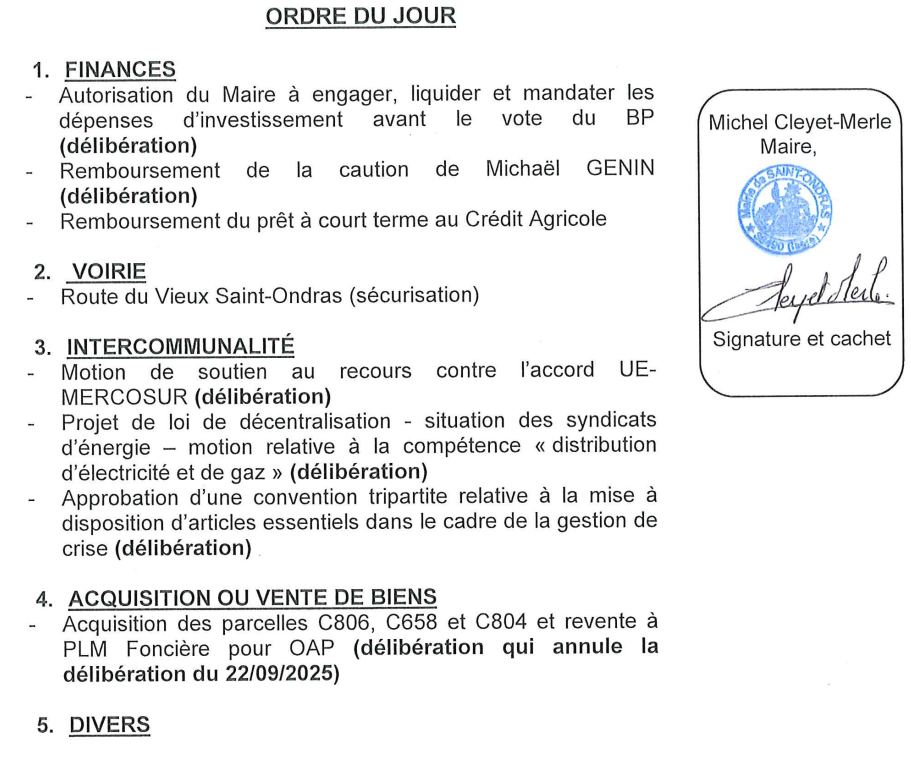 Le prochain conseil municipal aura lieu le lundi 16 février 2026 à 20h00 dans la salle du conseil de la mairie.